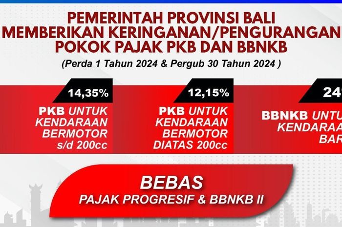 “Pemerintah Provinsi Bali memberikan keringanan pengurangan pokok pajak PKB dan BBNKB melalui (Perda 1 Tahun 2024 & Pergub 30 Tahun 2024),” tulis akun tersebut.