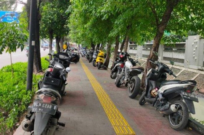 MOTOR Plus-online.com - Parkir motor sembarangan mengganggu kenyamanan pejalan kaki.