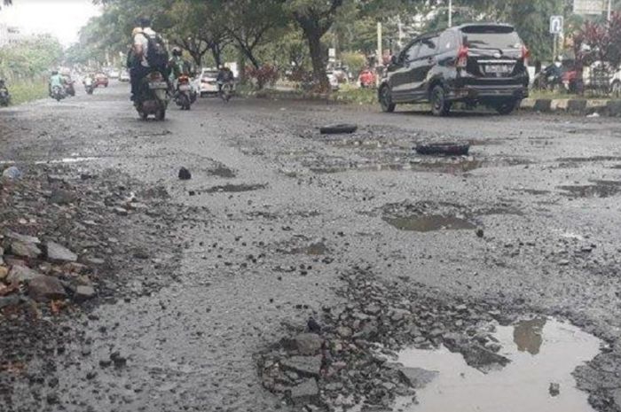 Pemotor atau pengemudi mobil jangan diam saja ketika melewati jalan rusak.