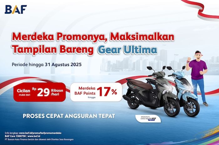 Tenang, nggak cuma itu aja, kalau BAF Friends mau cicilan lebih ringan juga ada lho, cukup dengan mengambil jatah jajan harian sebesar Rp29 ribuan per hari atau cicilan mulai dari Rp893.000,- per bulan, BAF Friends bisa dapetin Yamaha Gear Ultima 125 Hybrid Series dengan menyicil selama 41 bulan, serta beragam promo menarik lainnya untuk tipe motor Yamaha di area tertentu.