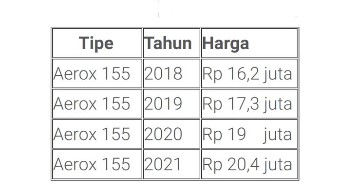 Berikut daftar harga motor bekas Yamaha Aerox 155 tahun 2018-2021 yang diambil dari daftar harga pedagang.