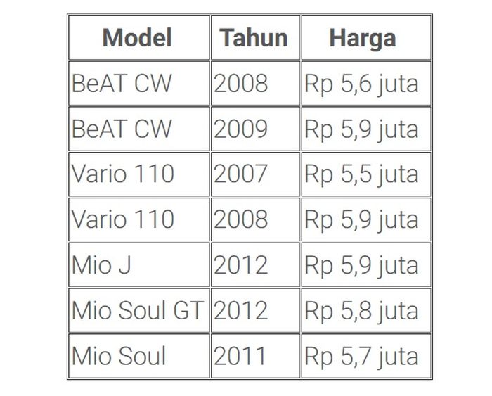 "Kalau matic bekas yang harga Rp 5-6 jutaan sih, ada Honda BeAT karbu 2008, Honda Vario 110 karbu 2009, Yamaha Mio Soul, dan Yamaha Mio J 2012, untuk pajak ada yang mati 1-2 tahun" bebernya.