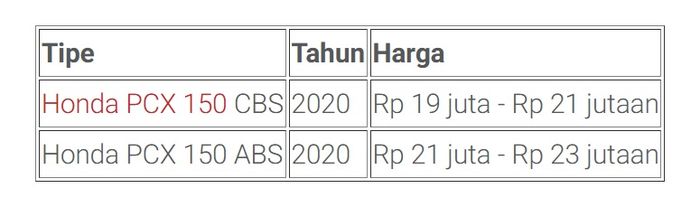 Berikut harga motor Honda PCX tahun 2020: