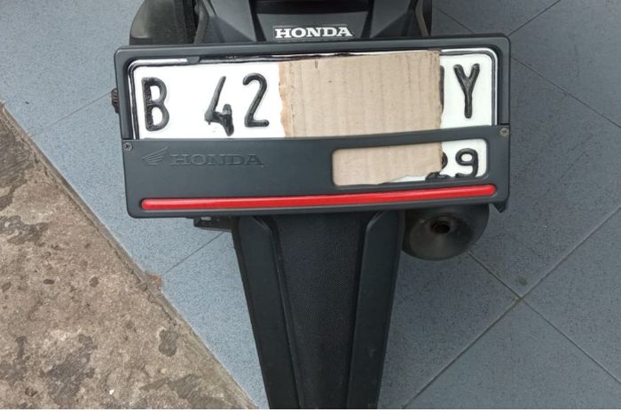 Selain menutup pelat nomor, pemilik kendaraan juga memakai pelat nomor palsu.