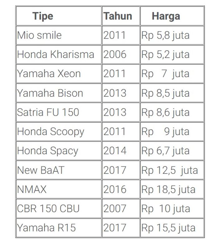Sedangkan buat yang lebih suka tipe bebek, tersedia Suzuki Satria FU, Yamaha R15 dan Honda Supra X.