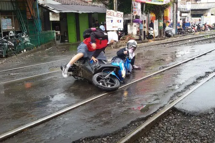 MOTOR Plus-online.com - Pemotor sering terjungkal, begini cara aman lewat rel kereta api saat hujan.