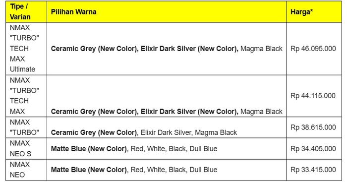 NMAX “TURBO” dan NMAX NEO saat ini dipasarkan dengan varian dan warna berikut: