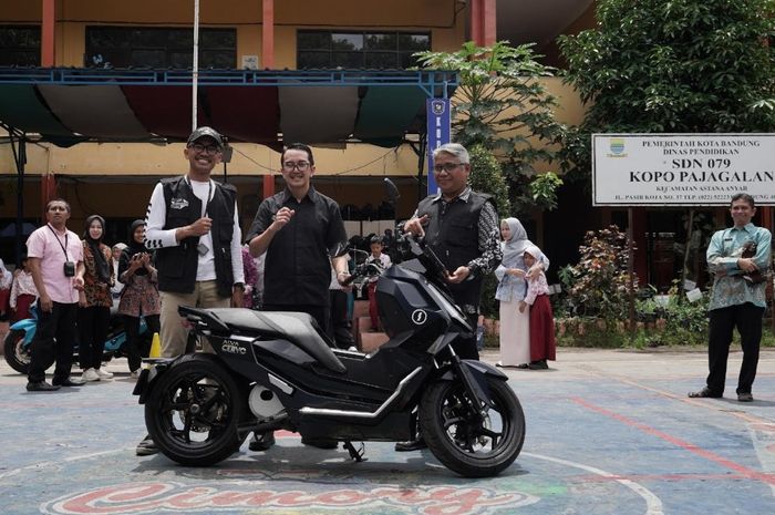 Kegiatan ini diisi dengan sesi edukasi safety riding, membagikan safety riding kit berupa vest dan helm, serta 1 unit motor listrik ALVA CERVO kepada pihak sekolah.