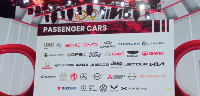 Dari segmen roda empat ada nama Audi, BAIC, BMW, BYD, Changan, Chery, Citroen, Denza, DFSK, Ford, GAC, Geely, GWM, Honda, Hyundai, i-CAR, Jaecoo, Jeep, Jetour, KIA, Lepas, Maxus, Mazda, MG, Mercedes Benz, Mini, Mitsubishi, Nissan, Seres, Suzuki, Toyota, VW, Wuling, dan Xpeng. Jumlah tersebut masih akan terus bertambah.