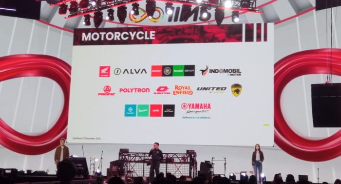 Dari kendaraan roda dua, hingga saat ini sudah ada AHM, Alva, Aprilia, Benda, Benelli, Indomobil E-Motor, Keeway, Morbidelli, Moto Guzzi, Pacific, Piaggio, Polytron, QJ Motor, Royal Enfield, Scomadi, United, Vespa dan Yamaha. Jumlah tersebut masih akan terus bertambah.
