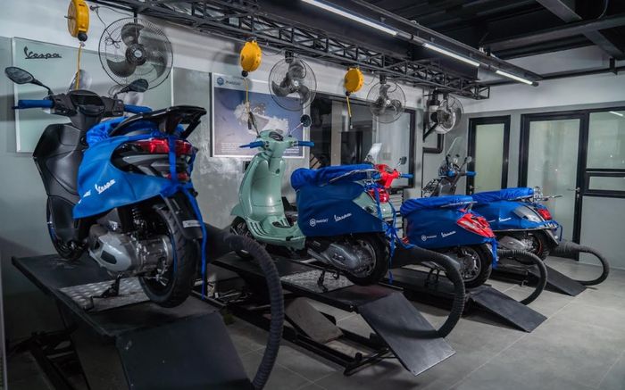 Di area showroom, pelanggan disambut dengan deretan skuter premium dari Piaggio dan Vespa yang tertata apik.