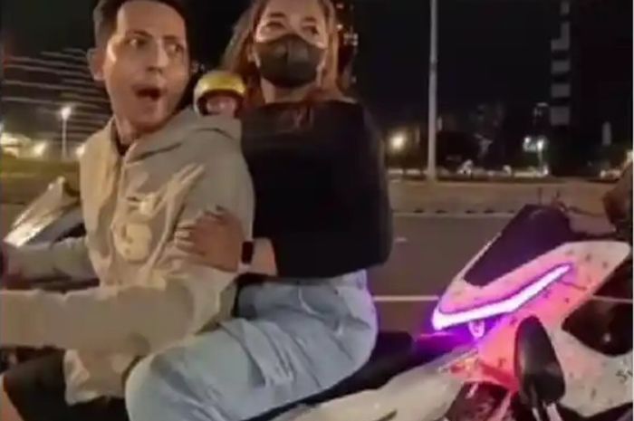 Dalam video yang beredar di media sosial, pria tersebut terlihat tidak mengenakan helm dan berboncengan dengan seorang perempuan.