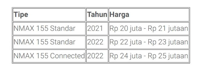 Soal harga di awal tahun 2026 di pasaran motor bekas, Yamaha NMAX 2021-2022 dibanderol Rp 20 juta sampai Rp 25 jutaan tergantung tipe dan kondisinya.