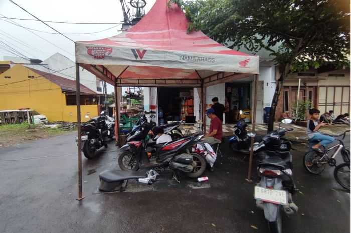 AHASS Terang Anugrah membuka tenda dan menurunkan beberapa mekanik untuk perbaikan motor.