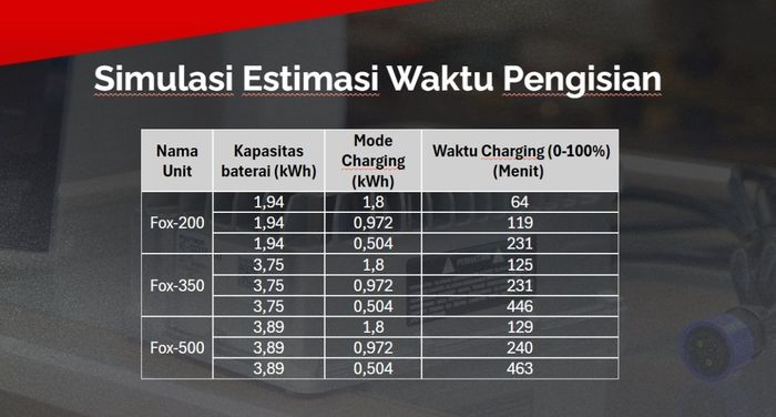 Dengan mode fast charging, pengguna FOX Electric dapat memperoleh jarak tempuh tambahan hingga 10 km hanya dalam 10 menit pengisian untuk FOX-350, serta hingga 20 km dalam 15 menit untuk FOX-200.