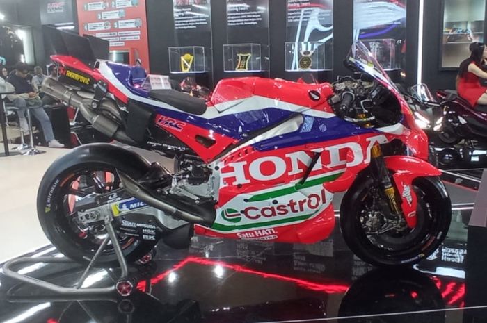Honda RC213V 2026 yang dipajang di booth Astra Honda Motor ini dominan warna merah, biru dan putih.