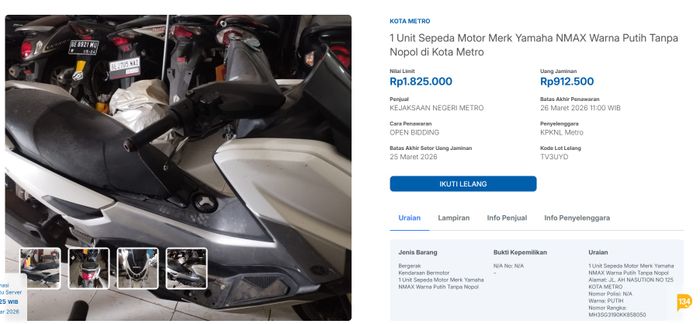 "1 Unit Sepeda Motor Merk Yamaha NMAX Warna Putih Tanpa Nopol di Kota Metro" demikian keterangan di situs lelang tersebut.