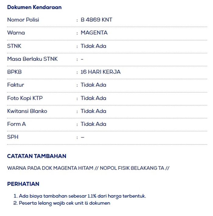 Rencananya lelang Honda BeAT ini akan dilaksanakan Jakarta Raya Motor yang berlokasi di Jalan Husein Sastra Negara Komplek Pergudangan Nusa Indah - Jurumudi, Tangerang.