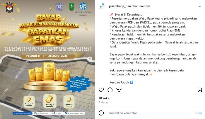 Ayo manfaatkan kesempatan ini! Setiap pembayaran PKB & SWDKLLJ berkesempatan memenangkan hadiah emas dengan total 7 pemenang selama periode program.
