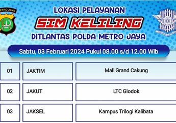 2 Tahun yang lalu - Catat lokasi dan jadwal SIM Keliling di Jakarta untuk hari ini, Rabu (31/1/2024). Cek masa berlaku SIM kalian.