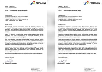 3 Tahun yang lalu - Surat pernyataan resmi dibuat Pertamina, jelaskan sudah membayar kewajiban untuk Mandalika Racing Team.