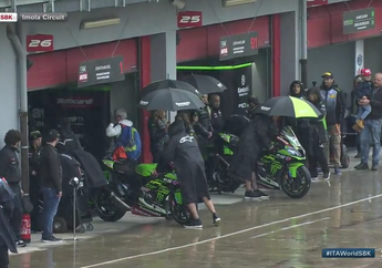 6 Tahun yang lalu - Cuaca tidak bersahabat saat akan berlangsung Race 2 WSBK Italia 2019 Hujan deras di sirkuit Imola, Italia.