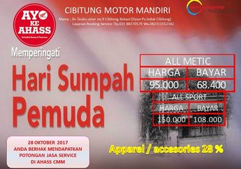 8 Tahun yang lalu - Peringatan hari sumpah pemuda pada tanggal 28 Oktober 2017 ini tidak sedikit yang memanfaakannya untuk menggelar promo. Seperti yang dilakukan oleh AHASS Cibitung Motor Mandiri (CMM) yang tergabung di Mitra Jaya Group memanfaatkan momen ini.